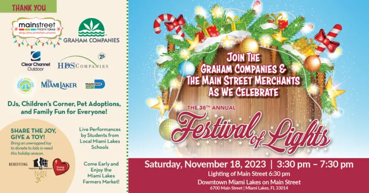 The holiday season kicks off on Saturday, Nov. 18, as The Graham Companies and Main Street Merchants come together to light up Downtown Miami Lakes and the iconic Main Street Oak Tree at the 38th annual Main Street Festival of Lights.