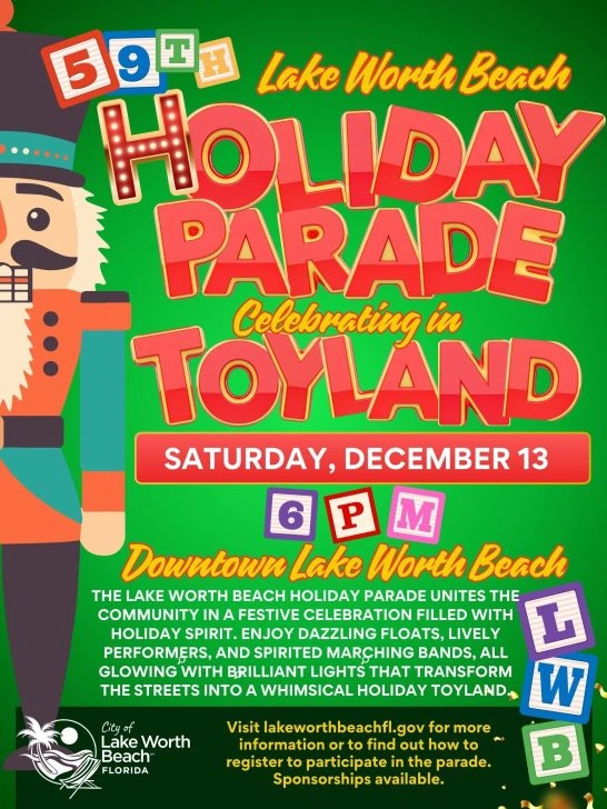 The 59th annual Holiday Parade will proceed as the sun sets and the streets of Lake Worth Beach will transform into a dazzling spectacle of twinkling lights and vibrant holiday cheer. Features decorated floats, local marching bands and community groups showcasing their holiday spirit.