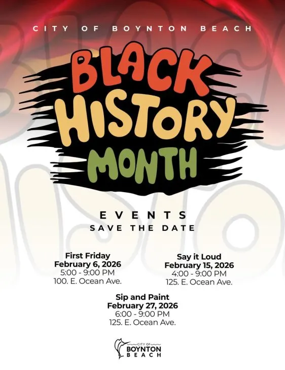 - Say It Loud: Sunday, Feb. 15, 2026, from 4 to 9 p.m. – An art, film, and music event at the Boynton Beach Arts & Cultural Center, 125 E. Ocean Ave.
