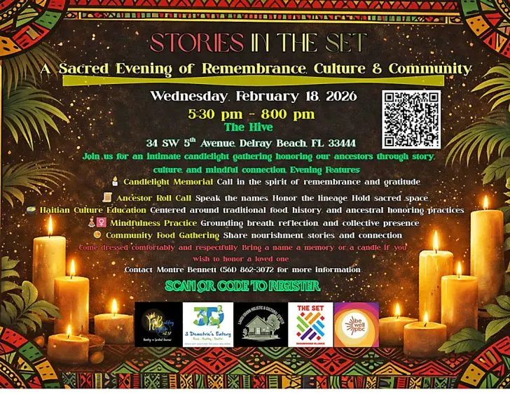 The SET Neighborhood Alliance presents A Sacred Evening of Remembrance, Culture & Community on Wednesday, Feb. 18, 2026, from 5:30 to 8 p.m. at The Hive, 34 SW 5th Ave., Delray Beach. RSVP via QR code.