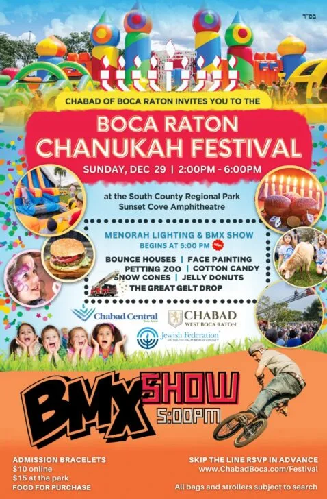 More details at: Boca Raton Chanukah Festival – Family fun event at South County Regional Park – ChabadBoca.com.