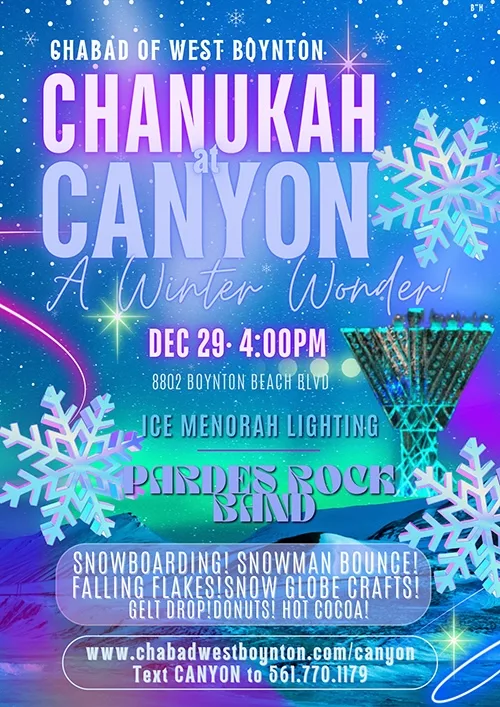 Chabad of West Boynton is hosting “A Winter Wonder” that not only includes an ice menorah lighting, but also snowboarding, snowman bounce, falling flakes, snow globe crafts, a gelt drop and donuts and hot cocoa.