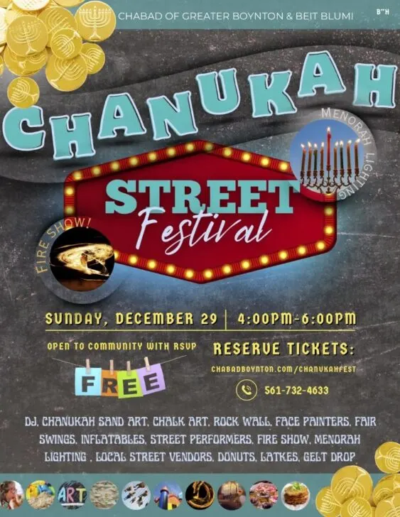 Features: A fire show, DJ, inflatables, street performers, menorah lighting, chalk art, rock wall, doughnuts, latkes and a gelt drop. Free with RSVP at chabadboynton.com/chanukahfest.