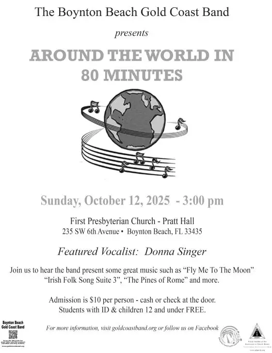 The Boynton Beach Gold Coast Band will perform several seasonal concerts in 2025-26 at various venues. Tickets are $10 at the door; children under 12 get in free.