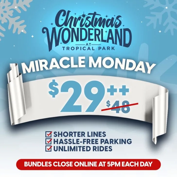 Drive by Tropical Park at night and you'll see millions of holiday lights and a huge ferris wheel and probably get squeals from the kids in the car. What was once called Santa's Enchanted Forest is now known as Christmas Wonderland and they are offering deals and discounts perfect for these last two weeks of the year.