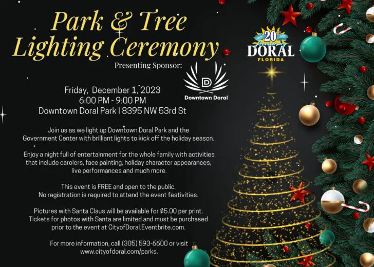 Sparkling holiday lights will dazzle at Downtown Doral Park and Government Center during Park and Tree Lighting Ceremony on Friday, Dec. 1 from 6-9 p.m.