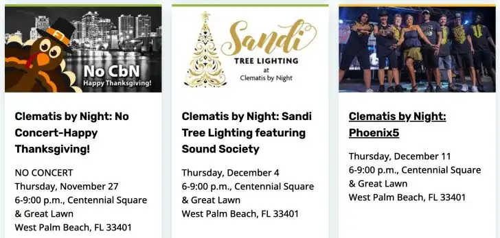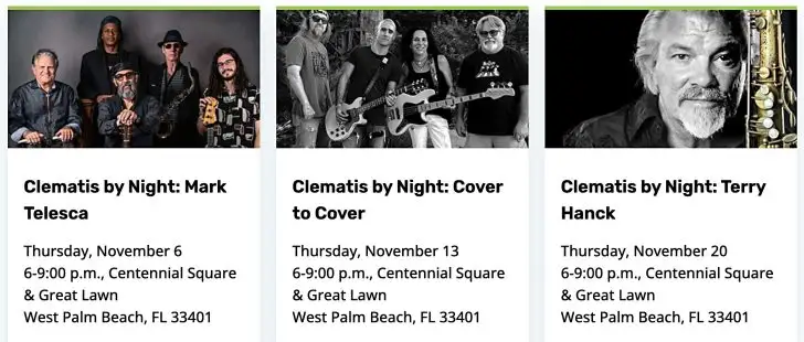 NOTE: The Clematis by Night free weekly concert series began in 1995 and has grown from a modest event in front of the former public library into a weekly waterfront celebration.