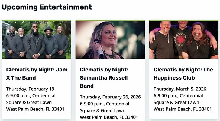 To see the current schedule and any last-minute updates, visit the live event page for Clematis by Night.