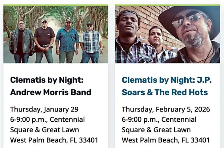 NOTE: The Clematis by Night free weekly concert series began in 1995 and has grown from a modest event in front of the former public library into a weekly waterfront celebration.