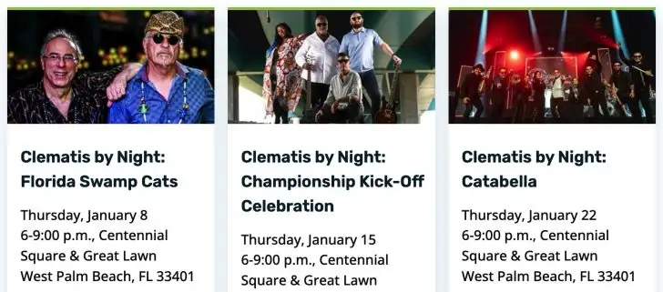 To see the current schedule and any last-minute updates, visit the live event page for Clematis by Night.