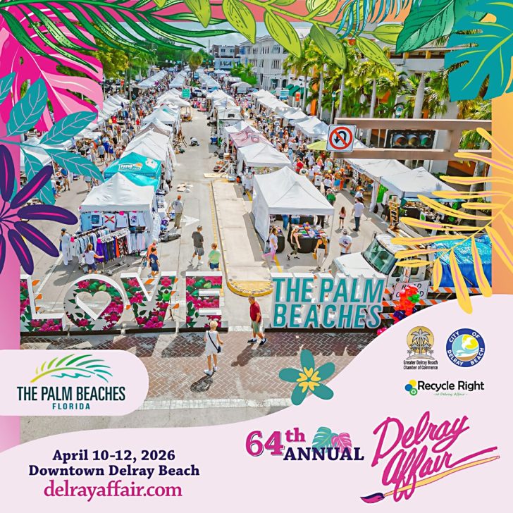 The Greater Delray Beach Chamber of Commerce will present the annual Delray Affair Friday, April 10, through Sunday, April 12, 2026, along Atlantic Avenue in Downtown Delray Beach. This event is free to attend. Vendor prices vary.