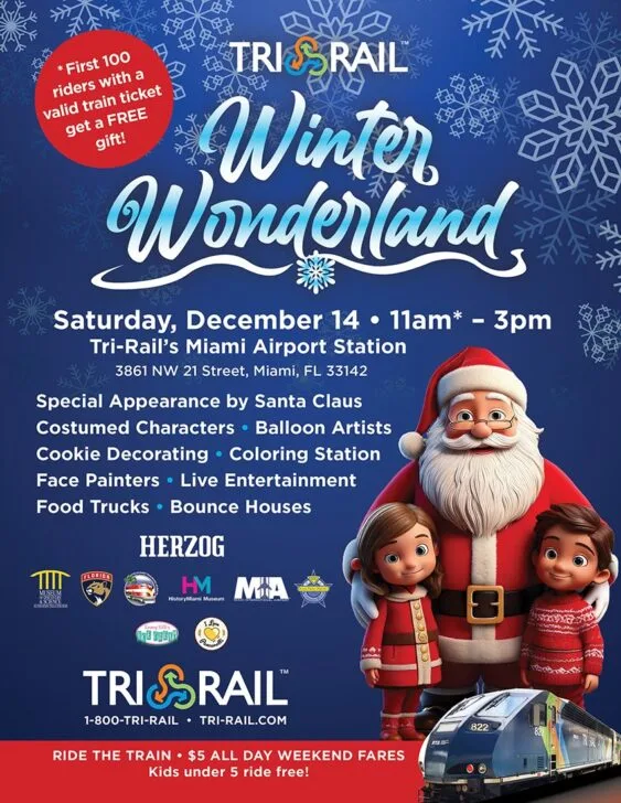 Tri-Rail’s “Winter Wonderland” presented by Herzog returns to Tri-Rail’s Miami Airport Station (3861 NW 21st Street, Miami 33142) on Saturday, December 14, 2024 from 11 a.m. to 3 p.m.