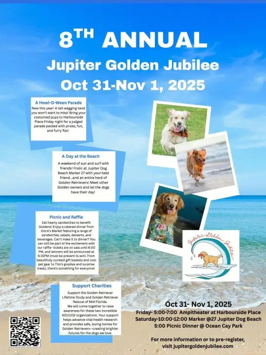 Here's a two-day event for golden retrievers and their owners that is also open to the public and it's happening on the last weekend of October. Event includes a costume parade and auction on Friday and beach activities with a picnic supper on Saturday at Jupiter Dog Beach and Ocean Cay Park.