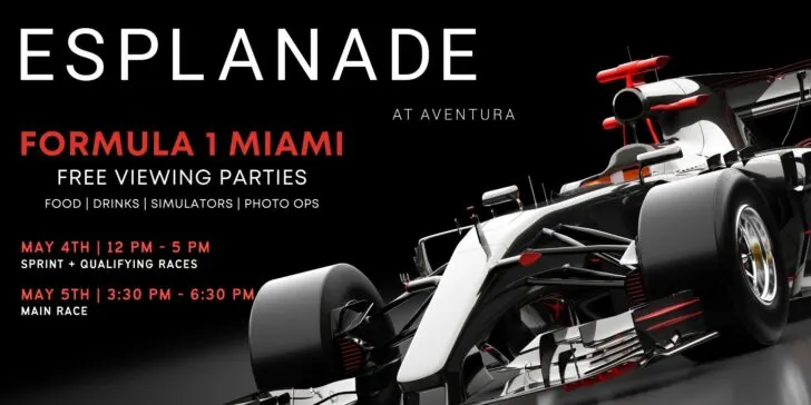 Esplanade at Aventura will be hosting Free F1 Viewing Parties with giant screens, racing simulators and more. Formula-1 enthusiasts of all ages are invited to join its two-day free and open-to-the-public viewing parties, from noon to 5 p.m. Reserve your spot on eventbrite.