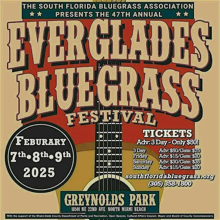 The South Florida Bluegrass Association is hosting the 47th Annual Everglades Bluegrass Festival from Feb. 7-9, 2025 at Greynolds Park in North Miami Beach.
