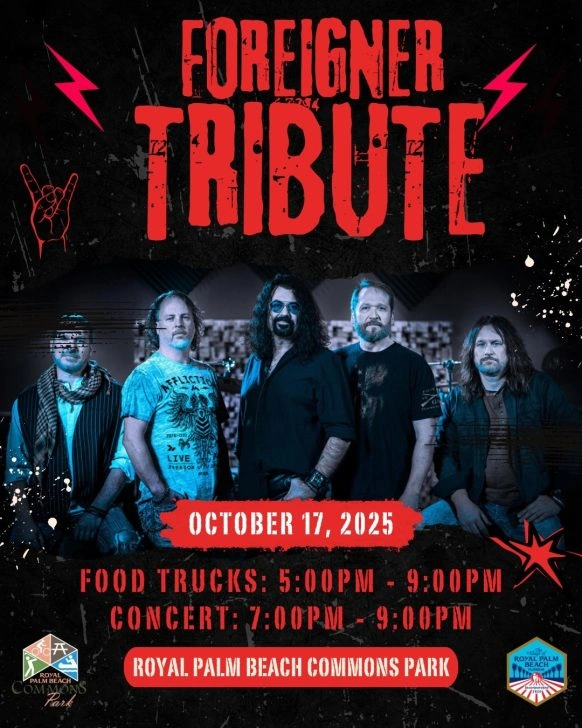 Here's a free concert on the Great Lawn at Commons Park, hosted by the Village of Royal Palm Beach. Featured entertainment is “Foreigner” tribute band and it promises to have plenty of food trucks onsite.