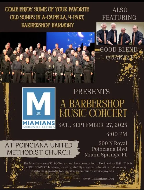 The Miamians Barbershop Chorus and Good Blend Quartet are performing a free concert at the Poinciana United Methodist Church on Saturday, Sept. 27, at 4 p.m.