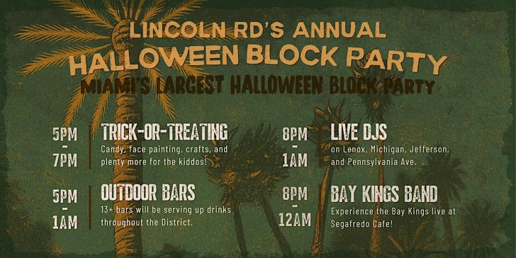 For Halloween on Friday, Oct. 31, 2025, the Lincoln Road pedestrian promenade will transform into a spooktacular event, with trick-or-treating for kids from 5 to 7 p.m.; and then a Halloween block party from 7 p.m. to 1 a.m.