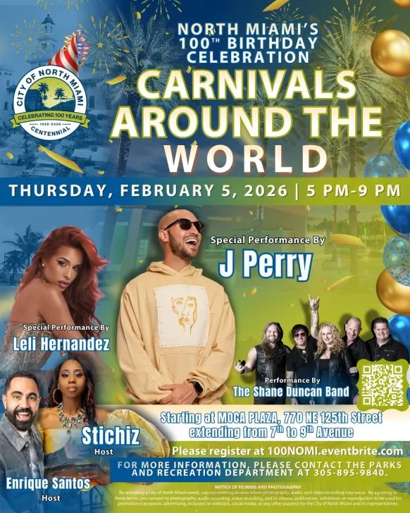 As part of the City of North Miami's Centennial Bash honoring their 100th birthday, MOCA Plaza in the heart of the city's downtown will be the site of Carnivals Around the World on Thursday, Feb. 5, 2026 from 5-9 p.m. Admission is free but RSVP is required on Eventbrite.