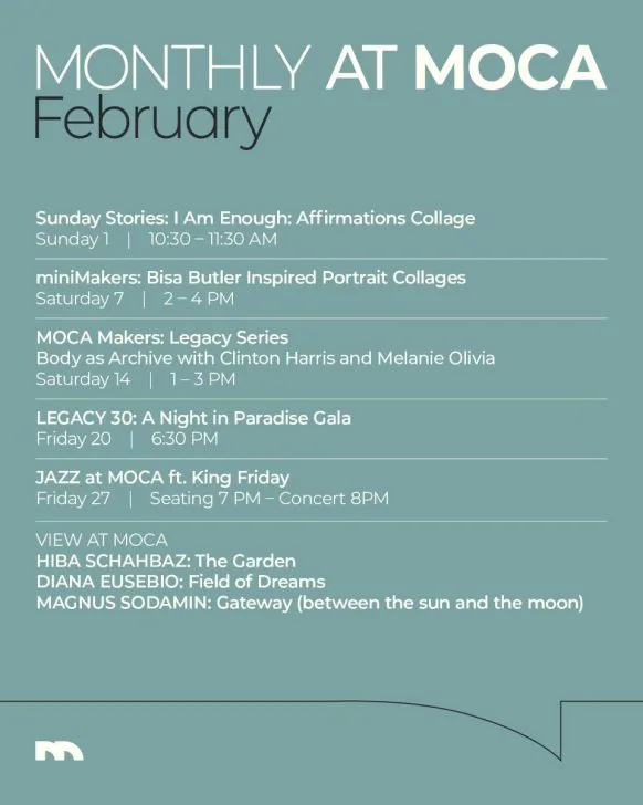 Saturday, Feb. 14 from 1-3 p.m., MOCA Makers: Legacy Series; Body As Archive workshop led by Miami-based dancer and performing artist Clinton “Tazz” Harris and teaching artist Melanie Oliva exploring the body as living archive and figure drawing used to record movement, memory and presence. $10 for members, $15 for non-members. Click here to RSVP.