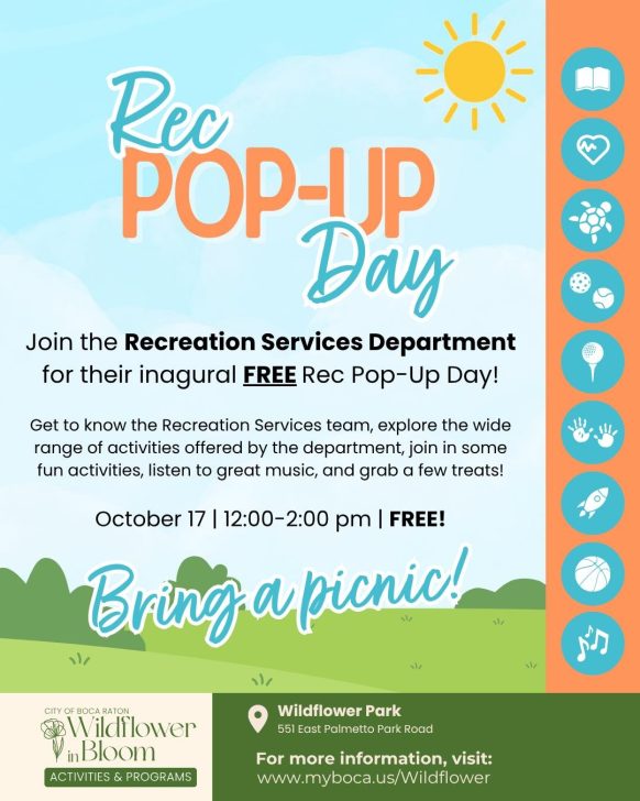 Since there is no school on Friday, Oct. 17, 2025, for students in Palm Beach County public schools, the City of Boca Raton is inviting families to its first-ever “Rec Pop-Up Day.” This is a day for you and your child to have an opportunity to explore, play, and create fun stuff for free!