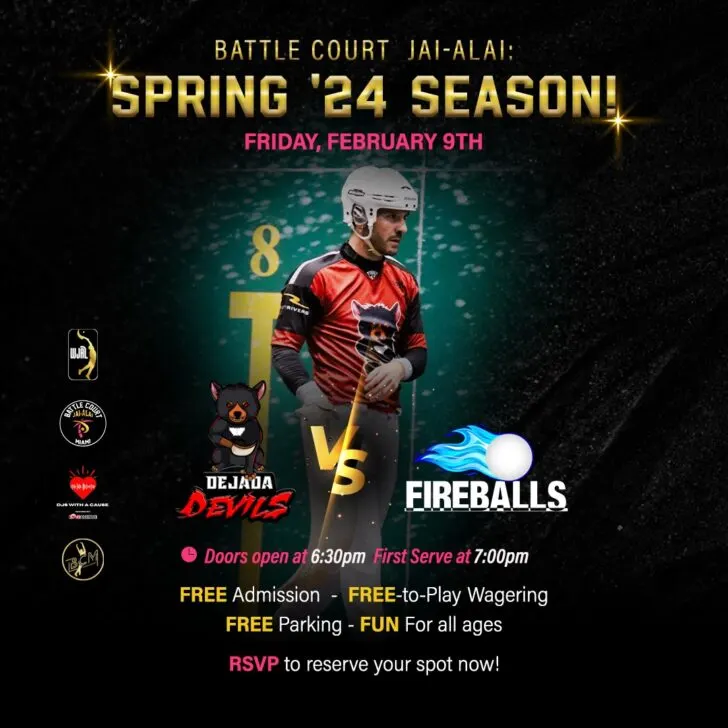 Battle Court match-ups are every Friday, plus two Sundays, Feb. 25 and March 3. For More Information and upcoming dates on Battle Court Jai-Alai, visit: jaialaiworld.com/battlecourt.