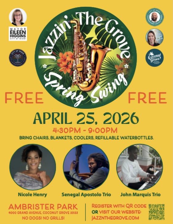 Everyone attending is encouraged to bring chairs, blankets and refillable water bottles. The free concert is co-sponsored by City of Miami Mayor Eileen Higgins, fellow Commissioners and the Coconut Grove Business Improvement District (BID).