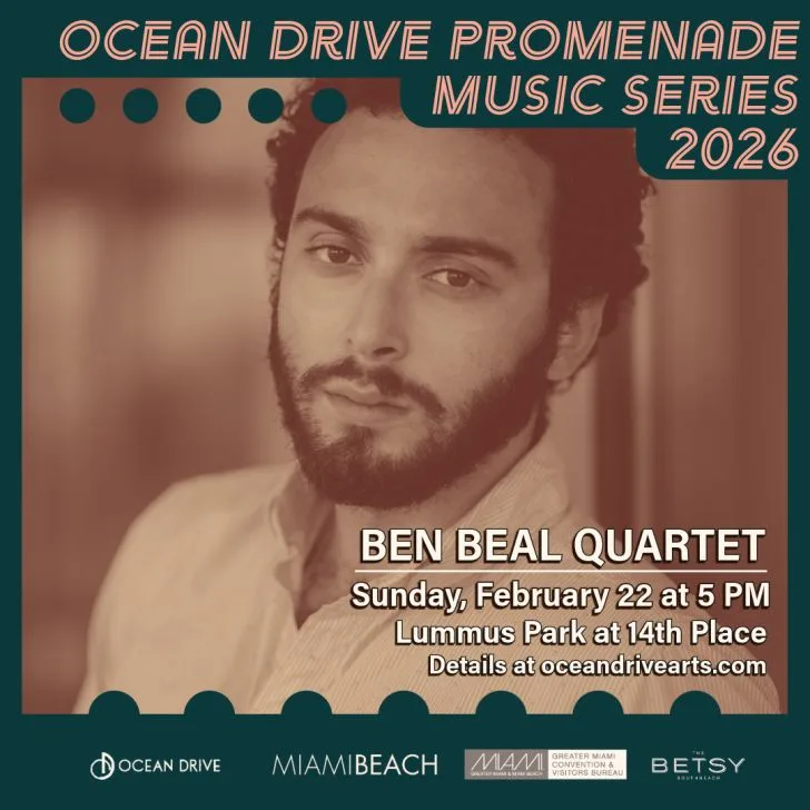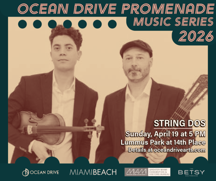 The Ocean Drive Promenade Music Series presents a free concert every Sunday from 5-6:30 p.m. between 14th Street and 14th Place in Lummus Park on Ocean Drive in Miami Beach in front of The Betsy Hotel.