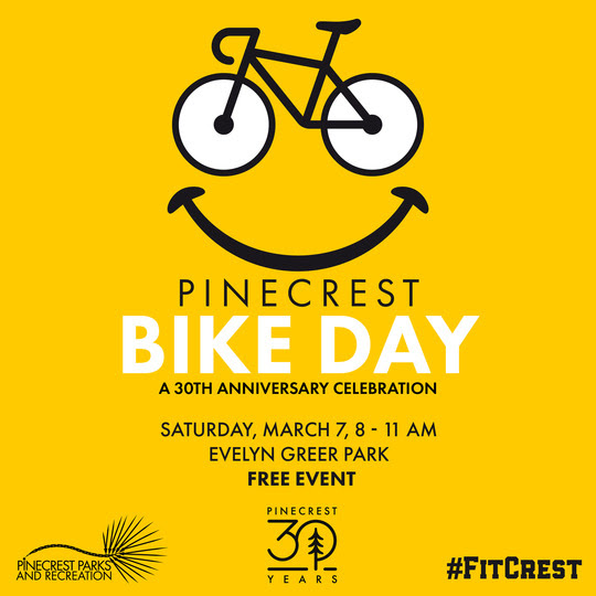 Pinecrest Parks & Recreation Department is hosting a family-friendly Pinecrest Bike Day event on Saturday, March 7 from 8-11 a.m. at Evelyn Greer Park as part of the Village of Pinecrest 30th Anniversary.
