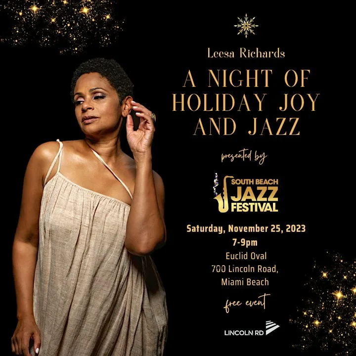 Experience the magic of jazz for the holiday season with the free SOBE Jazz Holiday Concert with Leesa Richards on Saturday, Nov. 25, 2023, from 7 to 9 p.m. at the Euclid Oval at 700 Lincoln Rd. on Miami Beach.