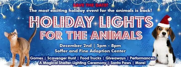 The Humane Society of Greater Miami is hosting its annual Holiday Lights for the Animals event at the Soffer and Fine Adoption Center, 16101 W. Dixie Highway, in North Miami Beach on Saturday, Dec. 7, from 5 to 7 p.m.