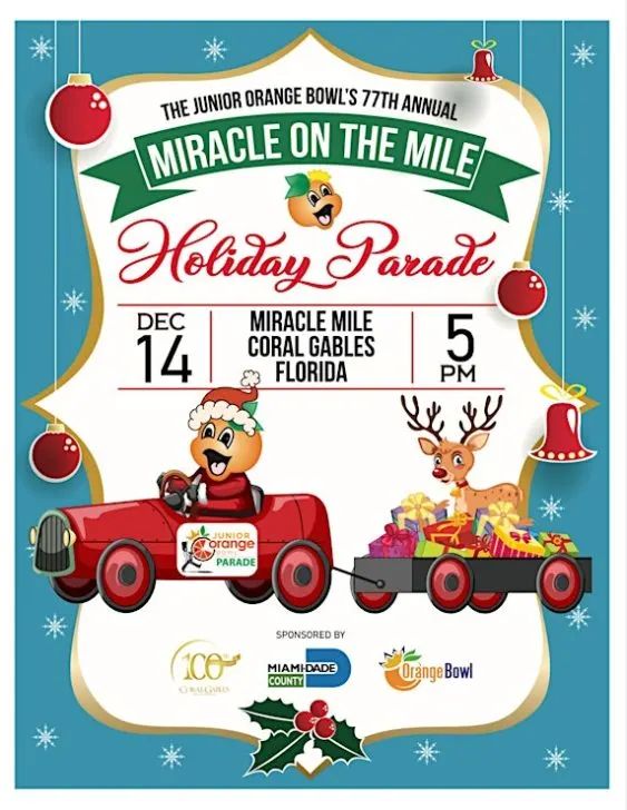 In celebration of active youth and community, the The Junior Orange Bowl Parade will take place on Sunday, December 14, 2025 at 5 p.m. The theme is “Miracle on the Mile: A Holiday Parade and Celebration.”