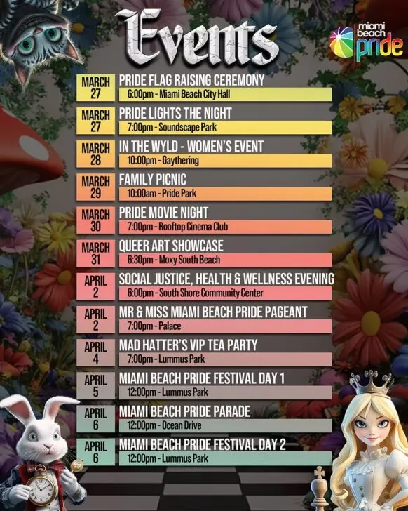 Miami Beach Pride events: March 27, 2025, to April 6, will bring together members of the lesbian, gay, bisexual and transgender community, their friends, allies and supporters to celebrate the unique spirit and culture of the LGBTQ+ community in Miami Beach.
