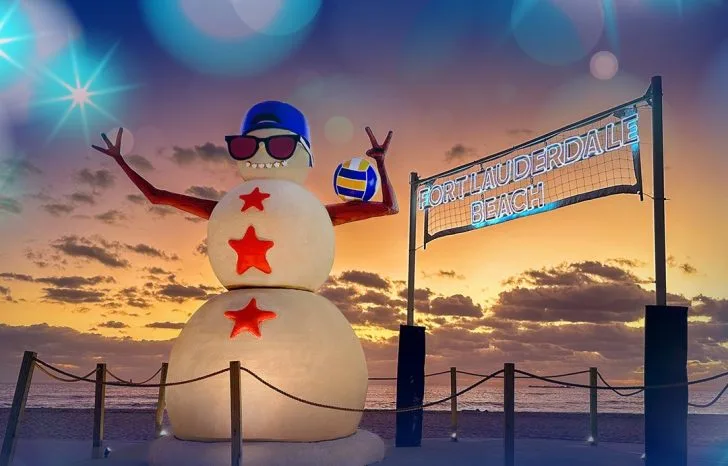 Fort Lauderdale offers a whimsical twist on holiday decorations and photo opportunities. Olas The Beach Snowman with sunglasses, a tropical shirt and bright orange nose is poised at the beach off Las Olas Boulevard.