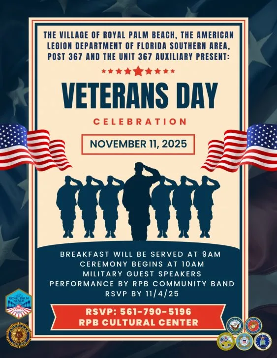 Tuesday, Nov. 11, 2024; breakfast at 9 a.m., ceremony at 11 a.m. Free with RSVP by Nov. 4; call 561-790-5196.