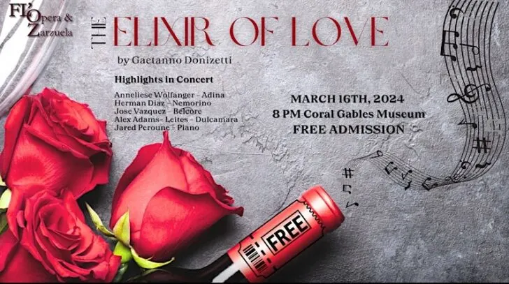 Coral Gables Museum is hosting a Saturday evening of music and love with some of the best moments of “The Elixir of Love,” an Italian Opera classic by Gaetano Donizetti and presented by FLorida L'Opera & Zarzuela.