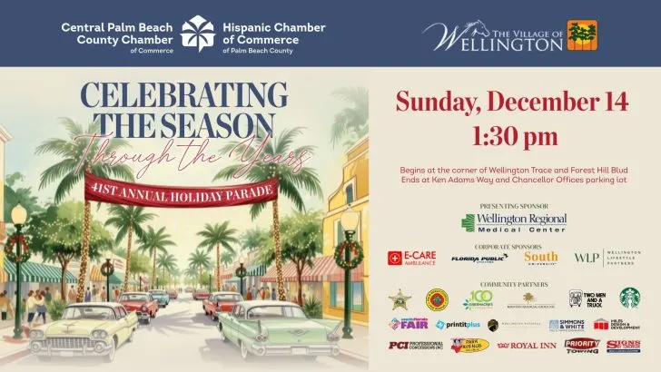 This year's annual Wellington Holiday Parade the 41st event is presented by the Village of Wellington and in partnership with the Central Palm Beach County Chamber of Commerce and the Hispanic Chamber of Commerce of Palm Beach County.